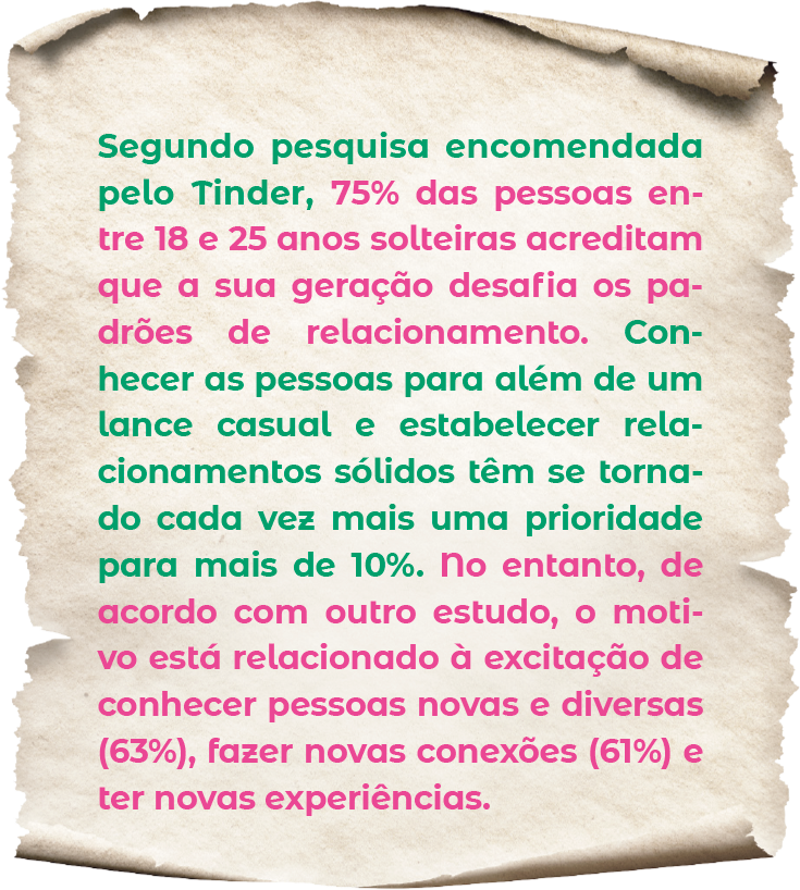Se tem alguém com a cabeça mergulhada demais nos problemas do mundo real contemporâneo para se perder em ilusões de contos de fadas, esses são os Gen Z – a geração que nasceu após a metade da década de 1990. Marcados por um ambiente inseguro de enxurradas de informação, crises econômicas e políticas, violência armada, mudanças climáticas e até uma pandemia, jovens entre 18 e 25 anos têm se voltado a construir segurança em si mesmos, priorizando questões como autenticidade e saúde mental. É o que revela o relatório The Future of Dating (O Futuro do Namoro) 2023, organizado pelo Tinder – o carro chefe dos apps de relacionamento.