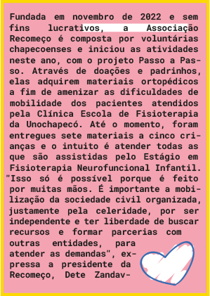 A Recomeço continua em busca de novos padrinhos e doações, não apenas no quesito financeiro, mas também pelo tempo que as pessoas podem oferecer para ajudar. Quem quiser conhecer mais de perto o trabalho da Associação, pode seguir @recomecochapeco no Instagram ou entrar em contato com a presidente Dete Zandavalli através do número (49) 98407-2148, ou com a vice-presidente Mara Dal Vesco (49) 99987-2035. Quanto mais pessoas se juntam em prol de uma causa, mais vidas podem ser transformadas.