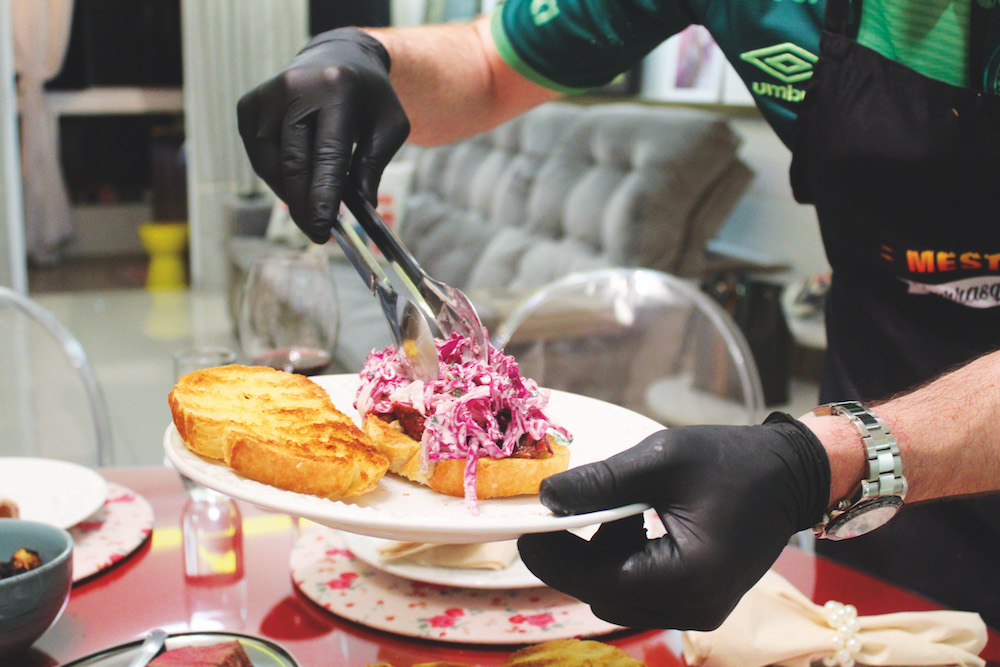 Depois de uma (não tão) breve conversa, Anderson aprontou a churrasqueira e começou a preparar o sanduíche de filé mignon assado com salada coleslaw — prato escolhido para a noite. Entre algumas taças de vinho, nos contou a origem de seu amor pela culinária. Desde jovem, era ele quem assava a carne aos domingos. “Para mim, fazer churrasco envolve a reunião em família. Porque é uma refeição preparada ao longo da semana, pensada para ser compartilhada”. Mas o gosto pela “brasa” aumentou após as viagens que fez ao Uruguai, Chile e à Argentina, quando conheceu outras técnicas de churrasco, como a parrilla (um sistema de grelhas móveis).