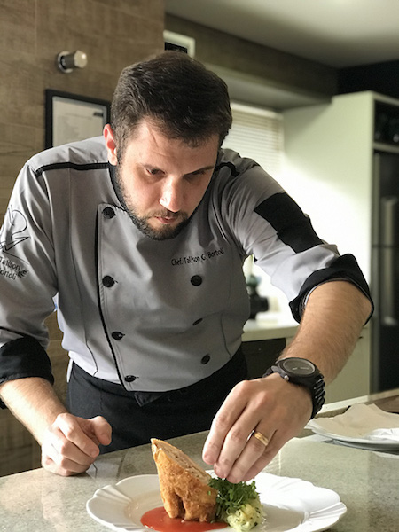 Na casa dele não há cadernos de receita. Até porque, na sua família poucas pessoas cozinhavam. E quando iam para a cozinha, as preparações cotidianas eram simples. Talison conta que sua paixão pela culinária surgiu cedo, ainda na adolescência. Certo dia, por pura teimosia, como ele recorda, decidiu replicar o molho de tomate preparado pela mãe, só para provar que conseguia, e assim tomou gosto pelo avental. Anos depois, ingressou na faculdade de Gastronomia, em Salvador, e desde então não parou de usar as panelas. Dos oito anos até a juventude, morou na Bahia. As idas e vindas da profissão no litoral nordestino, pois trabalhava somente durante as temporadas, o fizeram voltar a Chapecó. De lá, trouxe muita bagagem e depois de várias experiências em grandes restaurantes, resolveu abrir seu próprio negócio. Ao lado da esposa, Mônica, tem uma empresa de buffet para eventos.